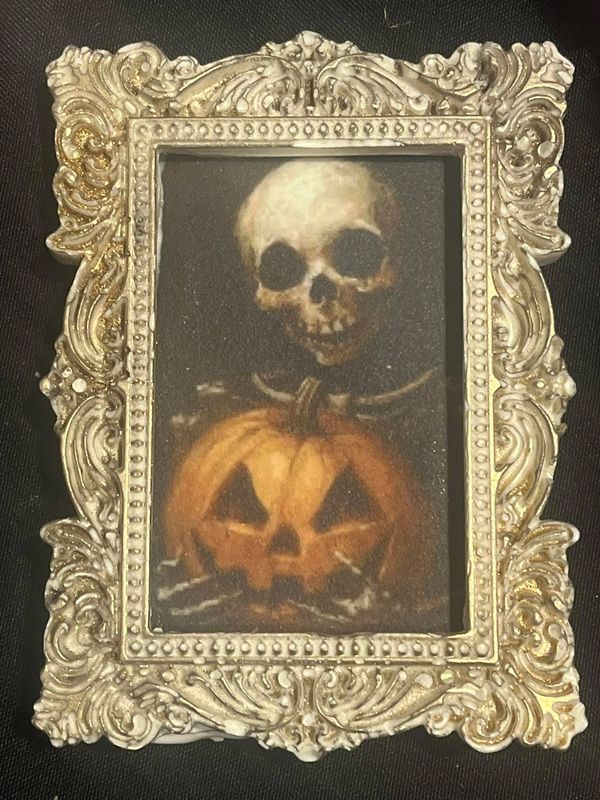 Homemade sugar cookie topped with a white chocolate molded vintage frame, dusted with edible gold and black luster dust for that antique look. "Art" is a vintage Halloween design, printed on edible icing sheets with food coloring - these are so much fun for Halloween!!!